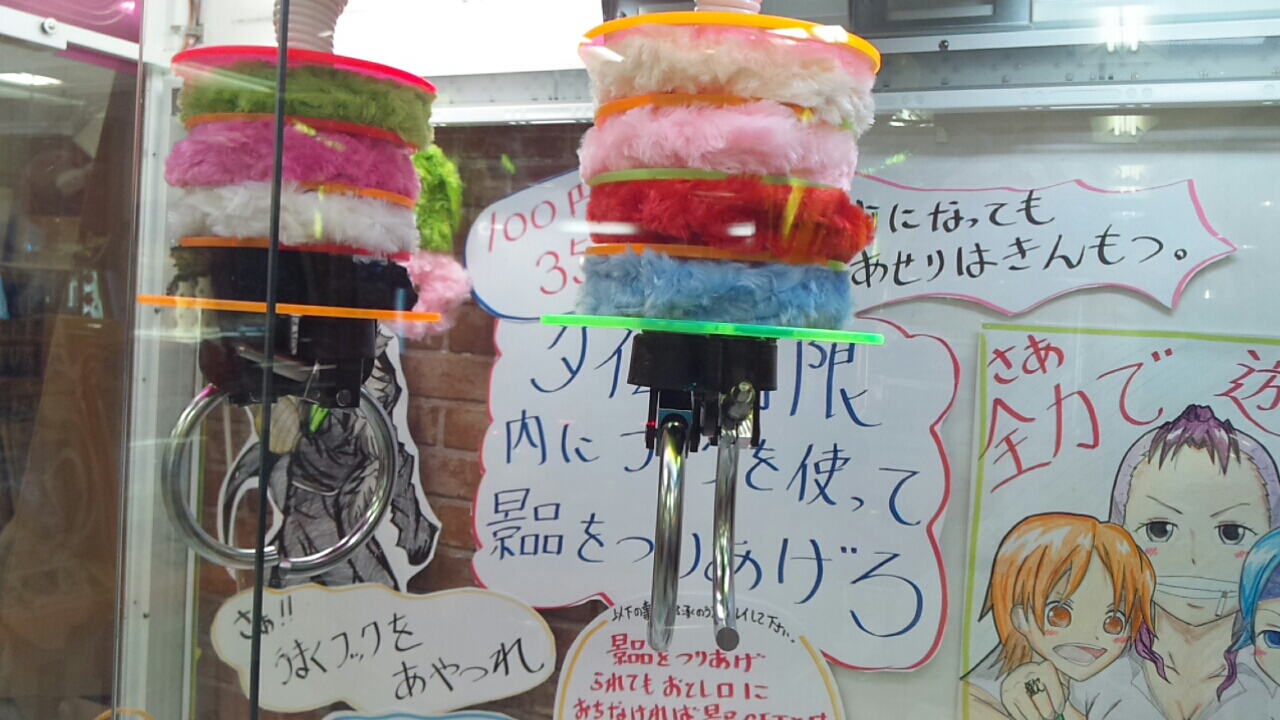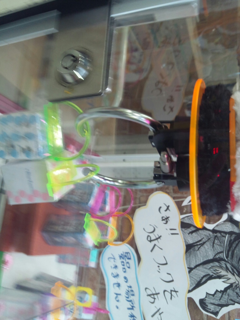 こないだの攻略の続き ゲーセン 2012年10月18日 曖昧すぎる記事なのでもう一度要点を押さえていきます 今日とった景品はこちら初めは1クレで簡単に獲得そのご銀さんほしくて600円以上は投資まあ攻略法書きますまずアームの形はい、ちゃんと撮影してましたこないだは手抜きで撮影してなかったのですみませんこのアームですが、重りが有るみたいですそして上下に動くのはワイヤー一本で動かしてますアームの方向なんですが自由が効きません物に当たると回転しますそしてこのアームかなり揺れますずっと一方方向に移動するとあまり揺れないですが、左右に移動したり下ボタンを何回も押すと揺れます移動とボタンを何回も押すことを組み合わせれば相当揺れます景品の向きや位置なんですがアームに対して十字形にいれるといっても片方のアームに引っかければ良いです位置なんですが届かない位置があります一番端は届きません、が景品を移動することは可能ですアーム揺らして移動これで動きます問題の取るまでの流れですが・・・まず欲しい景品まで移動+ダウン景品の真上に来たらダウン穴に合わせるここからが重要揺れていても穴に入りそう穴にはいったら時間切れまで待つアームが揺れるのを防ぐだめですアームが丸いので揺れると簡単に落ちるからです時間切れになってうまく持ち上げられれば取れたと思っていいでしょう(過剰に揺れない限りは・・・)うまくいけば1クレで取れます以上です (この筐体は回転率悪いなそして景品よく倒れるから定員さんをしょっちゅう呼ばないとなだから稼働してないところが多いのかな)追加情報アームを緩くできる設定がありそう(なので絶対取れる訳でもない)二個取り可能急いで撮ったからぼやけてるね( ̄▽ ̄;)おまけおそらく全部で2000~3000円で取れたうまくいけば三回に一回は取れるかな?(おおよそ) [0回]PR